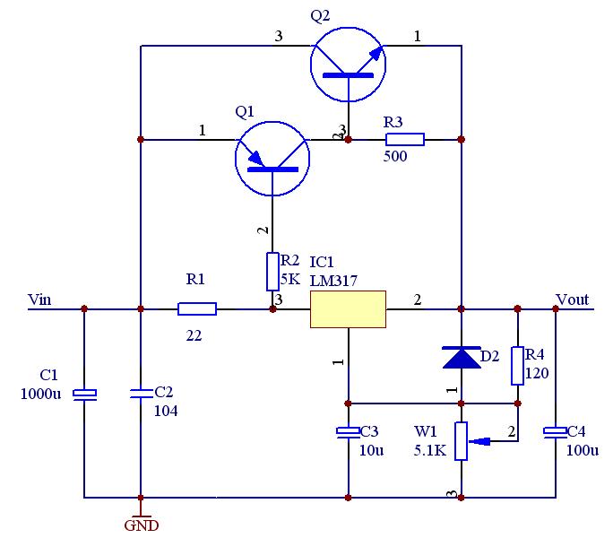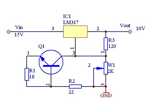 在需要使用大電流的情況下可用大功率管對(duì)電路進(jìn)行擴(kuò)流,這個(gè)電路是使用PNP型大功率三極管對(duì)LM317進(jìn)行擴(kuò)流。