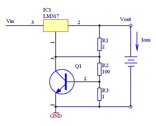 具有限流保護(hù)的充電電路Iom=0.6/1=0.6A,調(diào)整R3可調(diào)整充電電流。