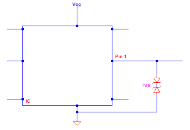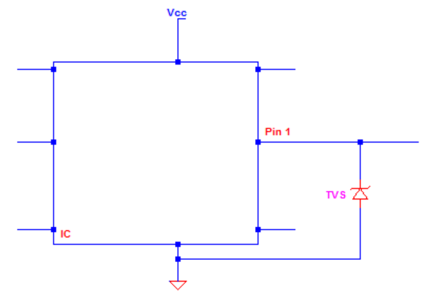 IC引腳旁邊的單向TVS。在電路正常運行時,TVS 不導(dǎo)通。當(dāng)有正尖峰時,電壓會被鉗位。當(dāng)出現(xiàn)負(fù)尖峰時,TVS將正向偏置并將尖峰轉(zhuǎn)向GND。