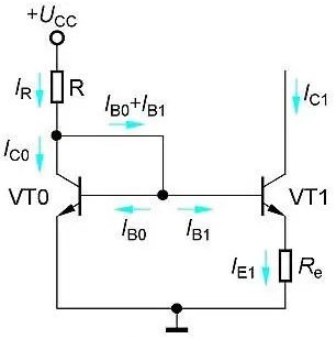 如下圖所示為鏡像恒流源電路,它由兩只特性完全相同的管子VT0和VT1構(gòu)成,由于VT0管的c、b極連接,因此UCE0=UBE0,即VT0處于放大狀態(tài),集電極電流IC0=β0*IB0。另外,管子VT0和VT1的b-e分別連接,所以它們的基極電流IB0=IB1=IB。設(shè)電流放大系數(shù)β0=β1=β,則兩管集電極電流IC0=IC1=IC=β*IB?梢,由于電路的這種特殊接法,使兩管集電極IC1和IC0呈鏡像關(guān)系,故稱此電路為鏡像恒流源(IR為基準(zhǔn)電流,IC1為輸出電流)。