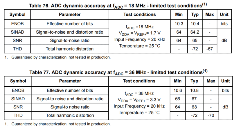 在使用內(nèi)置ADC的時(shí)候,我們要注意datasheet中相關(guān)的內(nèi)容,比如下面這個(gè)表里的表示ADC動態(tài)性能參數(shù),ENOB代表的是有效位數(shù),SIAND信號與噪聲失真比。